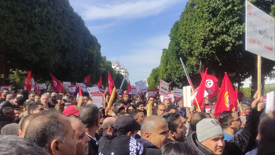 شهدت العاصمة التونسية السبت تجمعا شعبيا ومظاهرة حاشدة دعا اليها الاتحاد العام للشغل التونسي، رفضا لسياسات الرئيس قيس سعيد، وللتفاهمات التي تمت بين الحكومة وصندوق النقد الدولي التي ستؤدي الى خصخصة المؤسسات الاقتصادية ورفع الدعم ، وضد تردي الأوضاع الاقتصادية والاجتماعية في البلاد، والاعتراض على سلسلة الاعتقالات التي طالت سياسيين وحقوقيين في تونس مؤخرا. وقال الأمين العام لاتحاد الشغل نورالدين الطبوبي خلال كلمة أمام المتظاهرين ان "تونس لن يكون فيها استبداد وقمع مهما كان الثمن"، ووجه الطبوبي التحية للشخصيات الحقوقية والسياسية التي تم اعتقالها مؤخرا، على خلفية ما عرف بقضية " التآمر على الدولة"، وها...