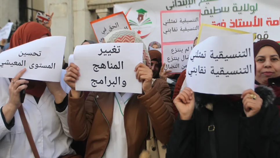 تجمع العشرات من أساتذة التعليم الابتدائي في وقفة احتجاجية أمام ملحق وزارة التربية بالعناصر في العاصمة، للمطالبة بتحسين أوضاعهم المهنية والاجتماعية الصعبة التي يواجهونها منذ مدة.ودعا أساتذة التعليم الابتدائي وزير التربية محمد واجعوط للتدخل من أجل تحقيق مطالبهم المرفوعة منذ 4 أشهر والسعي لتسوية وضعيتهم المهنية والاجتماعية.ورفع المعلمون شعارات "صامدون صامدون"، "الأستاذ مرفوع قدرا أعربتموه مكسورا قهرا"، "تغيير البرامج والمناهج ضرورة"، "تطبيق المرسوم الرئاسي بأثر رجعي"، "الحق في حرية التعبير والتنظيم".
