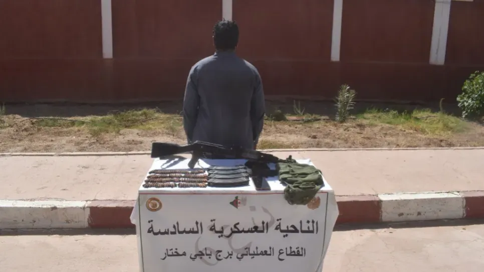 ففي إطار مكافحة الإرهاب، يضيف البيان، سلم الإرهابي المسمى التيباري حافظ، المكنى (قعساوي) نفسه للسلطات العسكرية ببرج باجي مختار بالناحية العسكرية السادسة، وبحوزته مسدس رشاش من نوع كلاشنيكوف وكمية من الذخيرة وأغراض أخرى.