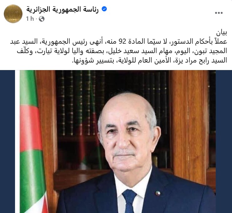 وجاء في البيان: "عملا بأحكام الدستور، لا سيّما المادة 92 منه، أنهى رئيس الجمهورية، السيد عبد المجيد تبون، اليوم، مهام السيد سعيد خليل، بصفته واليا لولاية تيارت، وكلّف السيد رابح مراد يزة، الأمين العام للولاية، بتسيير شؤونها".