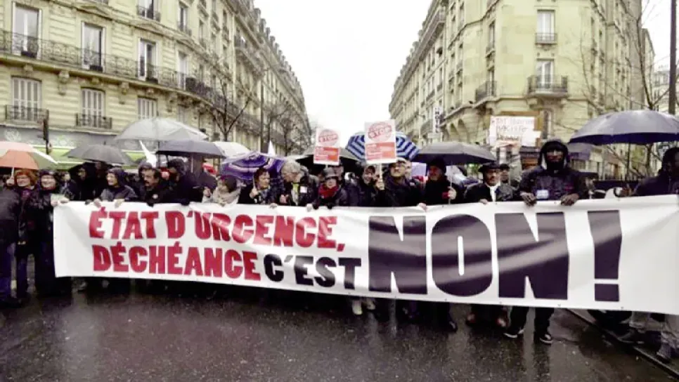 تظاهر أمس أكثر من 20 ألف شخص بباريس حسب المنظمين، و5500 وفقا للشرطة، والآلاف في 60 مدينة عبر التراب الفرنسي للتنديد بإلغاء التعديلات الجديدة التي مست الدستور. ويتعلق الأمر بمشروع إسقاط الجنسية عن مزدوجي الجنسية المتورطين في قضايا الإرهاب، مع رفض تمديد آجال حالة الطوارئ التي دخلت حيز التنفيذ منذ هجمات 13 نوفمبر الأخيرة، والتي من المقرر أن تنتهي في تاريخ 26 فيفري القادم، فمن المرتقب أن يتم تمرير هذه الإصلاحات أمام الجمعية الوطنية في 3 فيفري المقبل، على أن يتم التصويت عليها في 9 منه.وانطلقت المظاهرة بتجمع هؤلاء المحتجين بساحة الجمهورية مشيا تحت الأمطار والرياح إلى غاية ساحة “باليه روا...