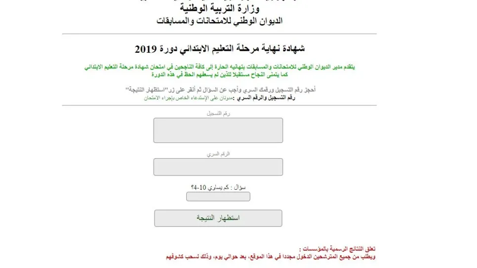 شرع مساء الیوم الأحد في حدود الساعة الـ 18:00 في الإعلان عن نتائج امتحان شھادة نھاية التعلیم الابتدائي "السانكیام" عبر الموقع الإلكتروني التابع للديوان الوطني للامتحانات والمسابقات العملیة: http://cinq.onec.dz/ وبلغت نسبة النجاح في الامتحانات لھذا العام 31 .83 بالمائة، حسب ما كشف عنه الیوم وزير التربیة عبد الحكیم بلعابد ".
