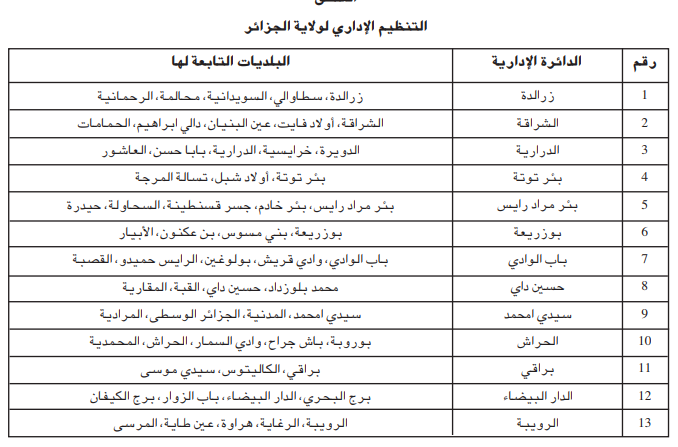 ويأتي هذا التعديل وفق ما تضمنه المرسوم، في إطار إعادة تنظيم الهياكل الإدارية لولاية الجزائر. ويحدد الملحق المرفق قائمة الدوائر الإدارية لولاية الجزائر، والتي تضم 13 دائرة، وهي: