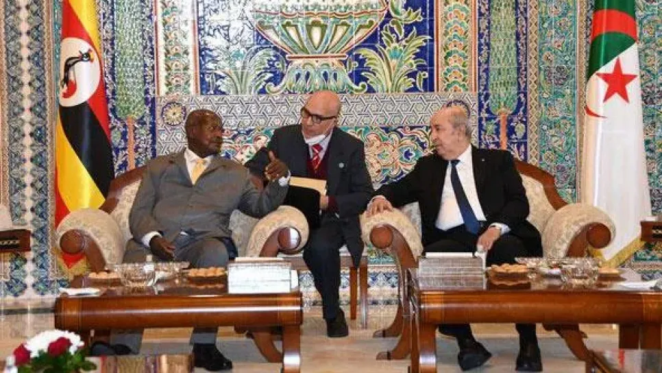 أشرف رئيس جمهورية، عبد المجيد تبون، رفقة نظيره الأوغندي، يوويري موسيفيني، اليوم الأحد، على مراسم التوقيع على اتفاقيتين وخمس مذكرات تفاهم في عدة قطاعات. وتشمل الاتفاقيتان ومذكرات التفاهم التي تم التوقيع عليها بمقر رئاسة الجمهورية، مجالات الطاقة, السياحة، التجارة، الفلاحة، الصحة الحيوانية، التعليم العالي والبحث العلمي. وقبل ذلك، كان رئيس الجمهورية قد أجرى مع نظيره الاوغندي محادثات توسعت بعدها الى أعضاء وفدي البلدين. وكان الرئيس الأوغندي قد حل أمس السبت بالجزائر في زيارة دولة تدوم الى غاية الثلاثاء القادم, بدعوة من رئيس الجمهورية، عبد المجيد تبون.