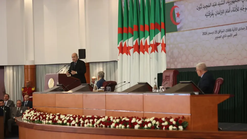 وقال رئيس الجمهورية في خطاب للأمة أمام البرلمان بغرفتيه بقصر الأمم بنادي الصنوبر: "سنواصل مساندة الشعب الفلسطيني في كفاحه من أجل نيل حقوقه المشروعة"، مضيفا بالقول: "نحن مع فلسطين ومع كل الشعوب المقهورة في العالم".
