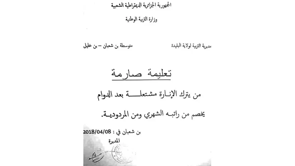 استحدثت مديرة متوسطة في ولاية البليدة طريقة جديدة لإجبار الموظفين على ترشيد الاستهلاك، حيث أصدرت إعلانا تذكر فيه أن “من يترك الإنارة مشتعلة بعد الدوام، يخصم من راتبه الشهري ومن المردودية”، وهو القرار الذي لاقى حفيظة العديد من الموظفين الذين وصفوه بـ“التعسف”، في حين قال آخرون إن “الغاية تبرر الوسيلة”. وخشي البعض الآخر من تكرار سيناريو الصراعات بين الموظفين والمسؤولين المحليين، التي قد تؤدي إلى انسداد وطني، على غرار ما وقع في الولاية نفسها قبل أشهر بين الموظفين التابعين للمجلس الوطني لمستخدمي التدريس ثلاثي الأطوار “الكنابست”، وبين مسؤولين محليين وا...