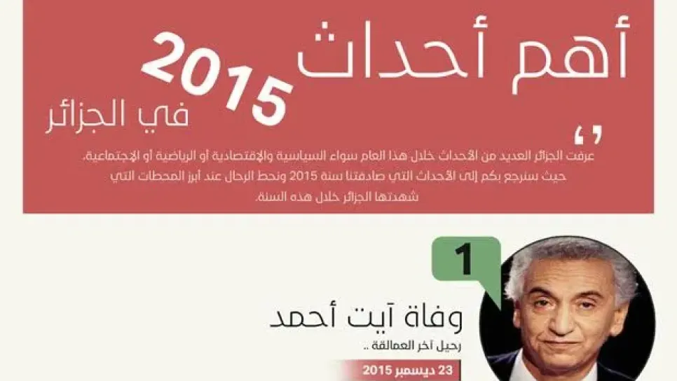 ساعات ونودع عام 2015 ، الذي كان حافلا بالأحداث، يتقدمها رحيل أحد أبرز زعماء الثورة التحريرية، حسين آيت أحمد، الذي سيوارى الثرى غدا بتيزي وزو، وقبله اقالة الجنرال توفيق بعد 25 سنة من ترأسعذه جهاز المخابرات، وأحداث أخرى نعرض عليكم أبرزها عبر هذه الانفوغرافيا.