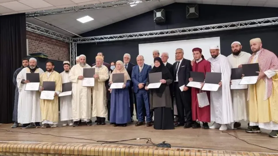 أشرف وزير الشؤون الدينية والأوقاف الدكتور يوسف بلمهدي رفقة عميد مسجد باريس الكبير الأستاذ شمس الدين محمد حفيز، مساء أمس السبت، على تسليم الشهادات للأئمة والمرشدات الدينيات الذين تابعوا تكوينهم بمعهد ابن باديس بالمسجد الكبير بباريس. وأفادت الوزارة، أن هذه الطبعة الأولى تمت الموافقة على تسميتها باسم "دفعة الشيخ محمد الطاهر آيت علجت" حيث سلمت شهادات التخرج للأئمة والمرشدات الدينيات بمدينة "لِيلْ" شمال الجمهورية الفرنسية، الذين تابعوا تكوينهم بملحقة معهد ابن باديس لمسجد باريس الكبير . واختتم حفل تخرج الأئمة والمرشدات الدينيات بقراءة جماعية للقرآن الكريم.