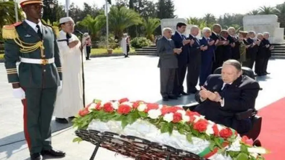 ترحم الرئيس عبد العزيز بوتفليقة اليوم الأربعاء بمربع الشهداء بمقبرة العالية على أرواح شهداء الثورة التحريرية بمناسبة إحياء الذكرى الـ 63 لاندلاع ثورة الفاتح من نوفمبر .1954 وحضر المراسم رئيس مجلس الأمة عبد القادر بن صالح ورئيس المجلس الشعبي الوطني السعيد بوحجة والوزير الأول أحمد أويحيى ورئيس المجلس الدستوري مراد مدلسي ونائب وزير الدفاع الوطني رئيس أركان الجيش الوطني الشعبي الفريق أحمد قايد صالح ووزير الدولة المستشار الخاص لرئيس الجمهورية الطيب بلعيز ووزير الشؤون الخارجية عبد القادر مساهل ووزير الداخلية والجماعات المحلية وتهيئة الإقليم نور الدين بدوي ووزير العدل حافظ الأختام الطيب لوح ووزير الم...