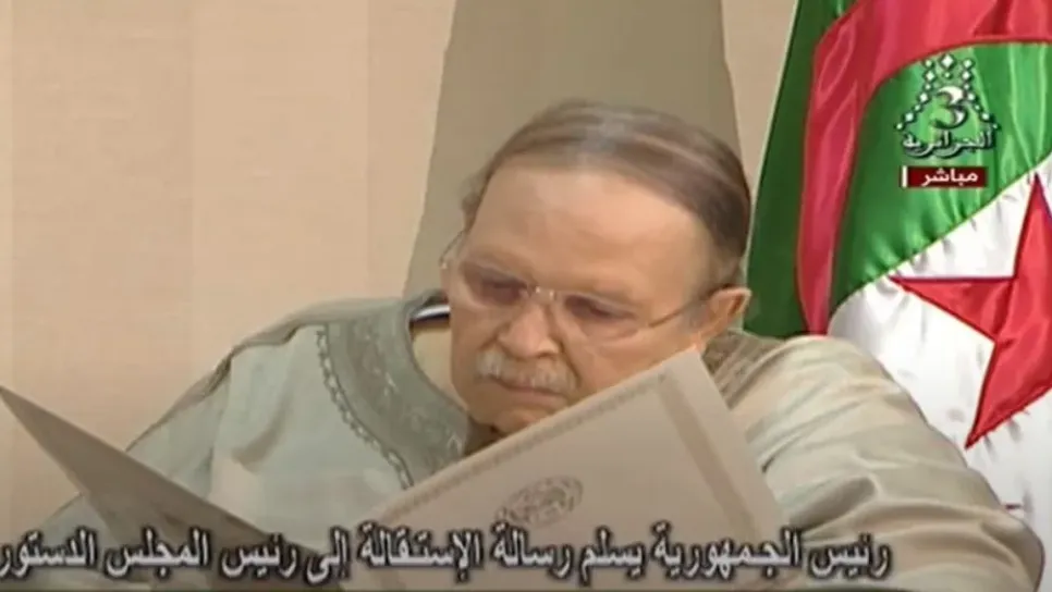 بث التلفزيون العمومي لقطات للرئيس بوتفليقة وهو يسلم رسالة استقالته إلى رئيس المجلس الدستوري الطيب بلعيز، وهذا بحضور رئيس مجلس الأمة عبد القادر بن صالح