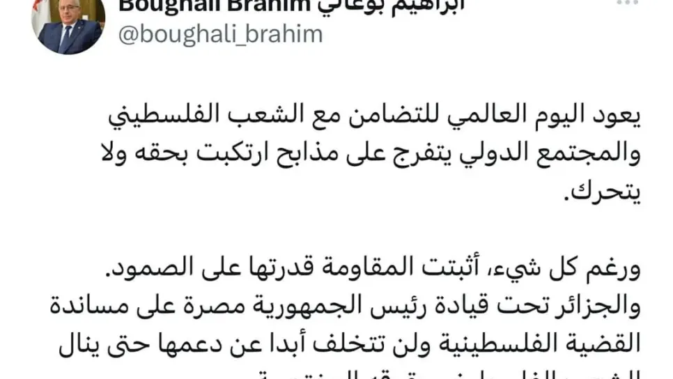 كتب رئيس المجلس الشعبي الوطني ابراهيم بوغالي منشورا بمناسبة السوم العالمي للتضامن مع الشعب الفلسطينيي.وقال غالي "يعود اليوم العالمي للتضامن مع الشعب الصحراوي والمجتمع الدولي يتفرج على مذابح ارتكبت بحقه ولا يتحرك".وأضاف غالي "ورغم كل شيء اثبتت المقاومة قدرتها على الصمود، والجزائر تحت قيادة رئيس الجمهورية مصرة على مساندة القضية الفلسطينية ولن تتخلف أبدا عن دعمها حتى ينال الشعب الفلسطينيي حقوقه المغتصبة".