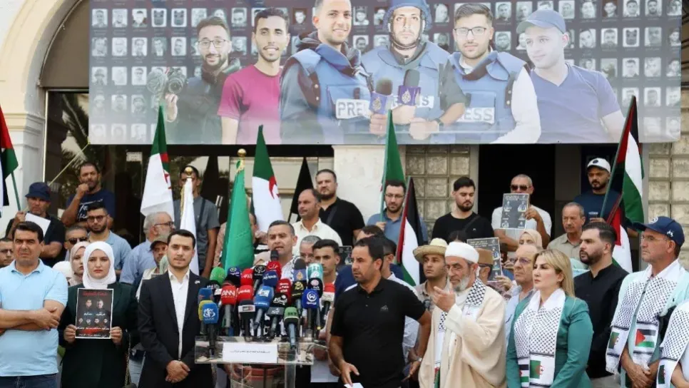 نظم صحافيون وإعلاميون جزائريون، اليوم الإثنين، بدار الصحافة "طاهر جاووت"، وقفة تضامنية مع الأسرة الإعلامية الفلسطينية، تنديدا باغتيال الاحتلال الصهيوني لـ 238 صحفيا فلسطينيا بغزة منذ السابع من أكتوبر 2023، في انتهاك صارخ لكل القوانين والأعراف الدولية.