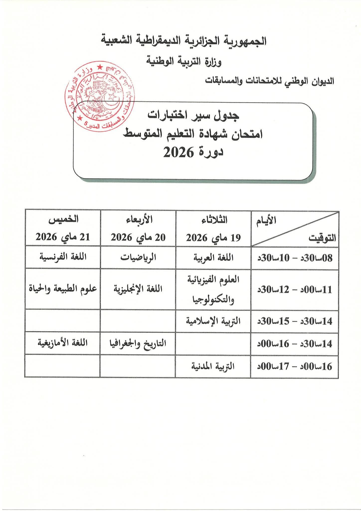 نشرت وزارة التربية الوطنية، اليوم الاثنين، جدول سير امتحاني شهادة التعليم المتوسط وشهادة البكالوريا دورة 2026.