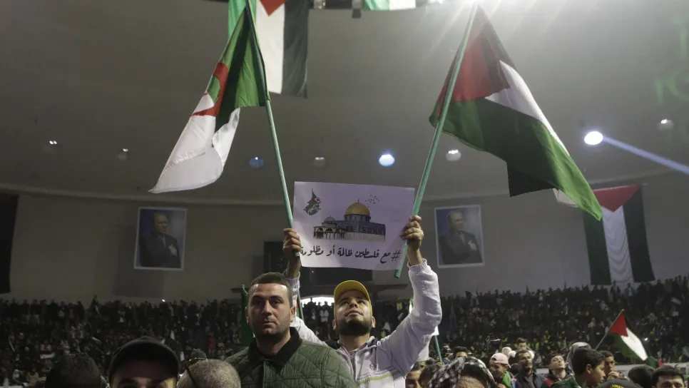 تجمع آلاف الجزائريين، اليوم السبت، في القاعة البيضوية لإعلان تضامنهم مع القدس ورفضهم لقرار ترامب الاعتراف بها كعاصمة للكيان الصهيوني. وشارك في هذا التجمع شخصيات سياسية وتاريخية جزائرية عبروا عن تضامنهم الكامل وغير المشروط مع القدس. ورفعت الجموع الحاضرة بالقاعة العلم الفلسطيني جنبا إلى جنب مع العلم الجزائري ، فيما صدحت القاعة بهتافات النصرة للقضية الفلسطينية والأناشيد الثورية. يُذكر أن السلطات العمومية وضعت القاعة البيضوية تحت تصرف هيئات المجتمع المدني والمواطنين لنصرة الأقصى.