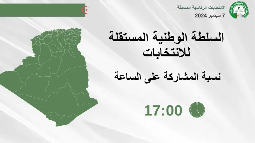 أعلن رئيس السلطة الوطنية المستقلة للانتخابات، محمد شرفي، أن نسبة المشاركة بلغت حتى الساعة الخامسة مساء داخل الوطن 26.46 بالمائة، حيث صوت 5142134 ناخب. بينما بلغت نسبة التصويت للجالية المقيمة بالخارج 18.31 بالمائة، حيث صوت 158489 ناخب من أصل 865490 مسجل. وكشفت السلطة نسبة الاقتراع في كل ولاية:
