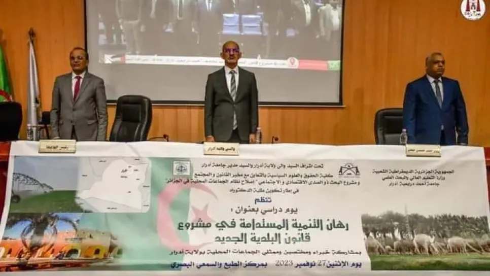 أشرف والي أدرار، العربي بهلول رفقة مدير جامعة أدرار والسلطات المحلية على فعاليات انطلاق أشغال اليوم الدراسي الموسوم بـ"رهان التنمية المستدامة في مشروع قانون البلدية الجديد"، المنظم من طرف كلية الحقوق والعلوم السياسية بالتعاون مع مخبر القانون والمجتمع ومشروع البحث ذو الصدى الاقتصادي والاجتماعي" إصلاح نظام الجماعات المحلية في الجزائر " وهذا بمشاركة خبراء ومختصين من مختلف جهات الوطن إلى جانب رؤساء البلديات وممثلين عن الجماعات المحلية بولاية أدرار وعدد من الطلبة والمهتمين بهذا الشأن، وألقى في الملتقى عدد من المداخلات والعروض تناولت بالشرح والتحليل الأساليب والأسس التي يمكن أن تجعل من البلدية باعتب...