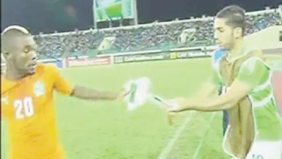 أصر متوسط ميدان منتخب كوت ديفوار، سيريدي، على إهداء عبد المومن جابو رمز بلده، خلال مواجهة ربع النهائي التي جمعت منتخبي الجزائر وكوت ديفوار، في إطار كأس أمم إفريقيا بغينيا الاستوائية. ومرد تصرف اللاعب الإيفواري، سيريدي، هو العلاقة التي لا تزال تربط لاعب “الفيلة” بالجزائر عامة، وبسطيف على وجه الخصوص، كونه لعب للوفاق عدة مواسم، قبل أن يحترف بالخارج. والصورة أصدق من كل تعبير.