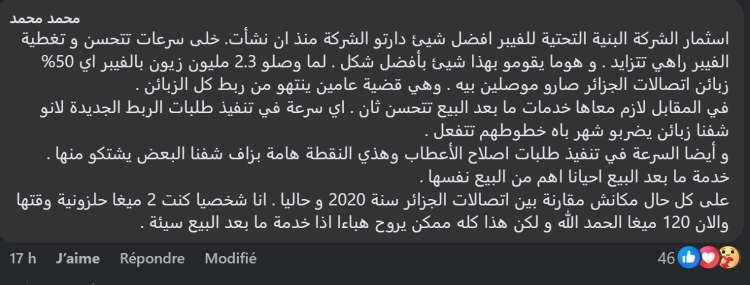 من جهته، قال الناشط "محمد محمد" في تعقيب له على الخبر، إن استثمار الشركة في البنية التحتية للألياف البصرية، هو أفضل ما قامت به الشركة منذ تأسيسها، داعيا في المقابل إلى تحسين الخدمات والإسراع في معالجة طلبات الزبائن وإصلاح الأعطاب.