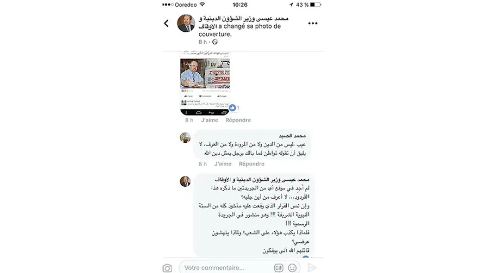 تفاجأ رواد التواصل الاجتماعي لتصريحات مثيرة لوزير الشؤون الدينية والأوقاف، محمد عيسى، على حسابه الشخصي بـ”الفايسبوك”، حول انتقادهم لمرسوم حول الأذان، والتي جاء فيها معجم القتل والكراهية، استخدامه الآية القرآنية: {قَاتَلَهُمْ اللهُ أنَّى يُوفَكُونَ}.. كما تفاجأ الصحفيون لتمادي الوزير في إبداء تصريحات غريبة جدا من أمثال: “ضعوا خناجركم فقد انتهى موسم العيد!”، و”قطعًا لدابر الفتنة التي تعوّد على إشعالها الخُنَّس المترصدون في كلّ مناسبة وبلا مناسبة”... ويرى بعض محيطيه أن ذلك يعود لحالة التوتر التي هو عليها منذ مجيء أحمد أويحيى لرئاسة الوزراء، وبسبب إخفاقاته في تح...