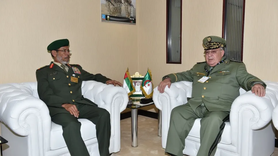 تحادث السيد الفريق أحمد قايد صالح نائب وزير الدفاع الوطني، رئيس أركان الجيش الوطني الشعبي، هذا اليوم 09 نوفمبر 2015، مع الفريق الركن حمد محمد ثاني الرميثي، رئيس أركان القوات المسلحة الإماراتية ، و ذلك في اليوم الثاني لزيارته إلى دولة الإمارات العربية المتحدة ممثلا لفخامة رئيس الجمهورية للمشاركة في فعاليات المعرض الدولي للطيران بدبي في طبعته الرابعة عشر. اللقاء تمحور حول تقييم حالة التعاون العسكري القائم بين جيشي البلدين في شتى المجالات، خاصة في مجال الصناعات العسكرية بمختلف فروعها، حيث أبدى الجانبان ارتياحهما لمستوى هذا التعاون ويطمحان إلى توسيع آفاقه إلى مستوى العلاقات القوية والمتينة...