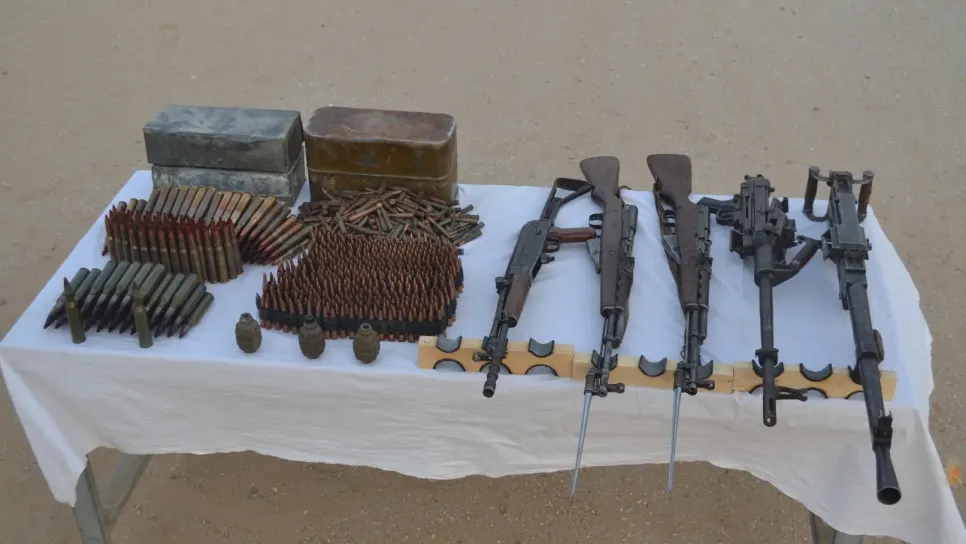 تمكنت مفرزة للجيش الوطني الشعبي، ظهر اليوم 29 ماي 2016، قي إطار حماية الحدود ومحاربة الجريمة المنظمة، وبفضل استغلال للمعلومات، من كشف مخبأ يحوي كمية من الأسلحة والذخيرة قرب الحدود الجنوبية للبلاد ببرج باجي مختار/ن.ع.6. مكنت هذه العملية من ضبط: - (01) رشاش من نوع PKT، - (01) بندقية رشاشة من نوع FMPK ، -(01) مسدس رشاش من نوع كلاشنيكوف، - (02) بندقيتين نصف آلية من نوع سيمونوف، - (03) ثلاث قنابل يدوية، - (974) طلقة من مختلف العيارات.