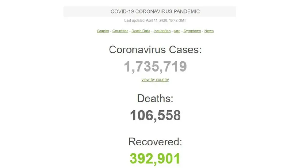 اقترب عدد المصابين بفيروس كورونا في العالم من 1.7 مليون شخص حتى أمس السبت، مع تسجيل 102607 حالة وفاة، حسب بيانات نشرها موقع جامعة ”جونز هوبكنز” الذي يجمع إحصاءات حول ضحايا الوباء. وبلغ عدد المصابين 1698416 شخص في 184 دولة حول العالم، توفي من بينهم أكثر من 102607 ألف شخص، وشفي أكثر من 376 ألف. ومنذ بداية الوباء، لجأ أكثر من نصف مليون شخص إلى الأطباء في الولايات المتحدة التي تعتبر الأولى في العالم من حيث عدد المصابين، ومن بين الدول الخمس الأكثر تضررا كانت إسبانيا (158.2 ألف) وإيطاليا (147.5 ألف) وفرنسا (125.9 ألف) وألمانيا (122.1 ألف).
