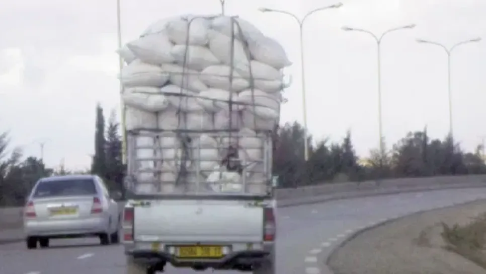 هذه الأكياس المحمولة فوق سيارة نفعية ليست أكياسا معبأة بالصوف، وإنما أكياس مملوءة بأعلاف المواشي، وهي حمولة زائدة، ما يشكل خطرا على مستعملي الطريق في حال سقوط أحد الأكياس غير مربوطة جيدا، فأين جهات الرقابة؟ الصورة مأخوذة من الطريق الوطني رقم 1 الرابط بين بلديتي عين معبد وحاسي بحبح بالجلفة.