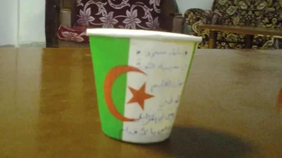 لم يجد صاحب مقهى  بلدية متوسة ولاية خنشلة طريقة لإظهار وطنيته باستخدام الراية الوطنية الكؤوس الورقية الخاصة بالقهوة، والتي تنتهي سلة القمامات يفرغ.