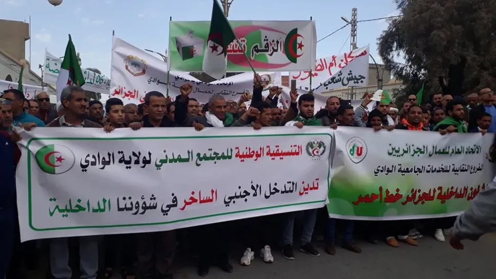 شهدت الوادي، أمس السبت، مسيرة ضخمة للتنديد بالتدخل الأجنبي ومساندة للجيش الوطني الشعبي. وقد توافد هؤلاء المتظاهرون من عدة بلديات وشارك فيها ناشطون بجمعيات ومنتخبون وممثلون عن المترشحين للرئاسيات. وقد جابت المسيرة الشوارع الرئيسية للمدينة، مع تنظيم وقفة أمام مقر الولاية، رفع خلالها المواطنون شعارات داعمة للجيش الوطني، ورافضة للتدخل الأجنبي على خلفية اللائحة التي أصدرها البرلمان الأوروبي، مؤخرا، حول سجن نشطاء الحراك. و تظاهر، أمس السبت، مواطنون ببلدية ديرة (جنوبي البويرة) للتعبير عن دعمهم للانتخابات الرئاسية يوم 12 ديسمبر. وتجمع هؤلاء المتظاهرون في الصباح بوسط مدينة ديرة وهم يحملون لافتات وأعل...