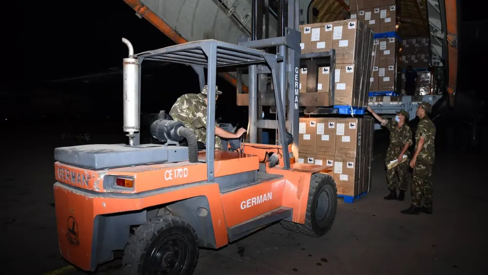 حطت، فجر اليوم الأحد، بالقاعدة الجوية بوفاريك بالناحية العسكرية الأولى، طائرتي نقل عسكريتين تابعتين للجيش الوطني الشعبي، على متنهما 1500 جهاز لتكثيف الأوكسجين. وأفاد بيان وزارة الدفاع الوطنية، أنه في "إطار الجهود المبذولة لدعم المنظومة الصحية الوطنية لمواجهة وباء كوفيد- 19 وضمان تكفل أمثل بالمصابين بالفيروس، تم اقتناء 1500 جهاز لتكثيف الأوكسجين من جمهورية الصين الشعبية لفائدة الصيدلية المركزية للمستشفيات". وهذه العملية ستليها عمليات مماثلة لجلب شحنات أخرى من التجهيزات الطبية واللقاحات مضادة لفيروس كوفيد-19.
