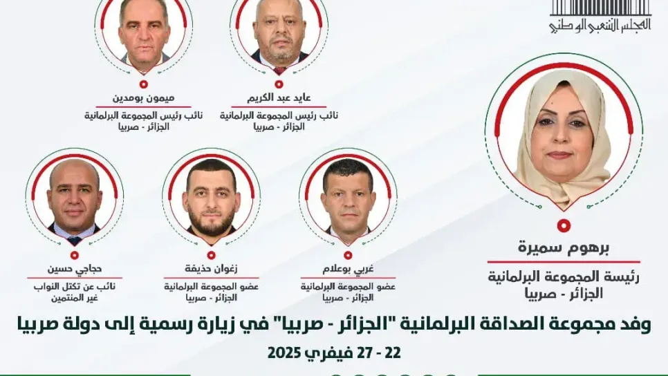 وأوضح نفس المصدر، أن "وفدا من المجموعة البرلمانية للصداقة الجزائر-صربيا، برئاسة السيدة برهوم سميرة، رئيسة المجموعة، يقوم بزيارة رسمية إلى جمهورية صربيا خلال الفترة من 22 إلى 27 فبراير الجاري".