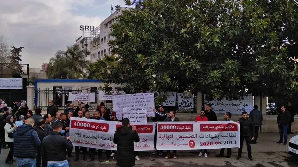 نظم، اليوم الأربعاء، مكتتبوعدل 2 لسنة 2013 تجمعا أمام مقر الوكالة الوطنية لتحسين السكن وتطويره بسعيد حمدين، بسبب عدم حصولهم شهادة التخصيص المتعلقة.