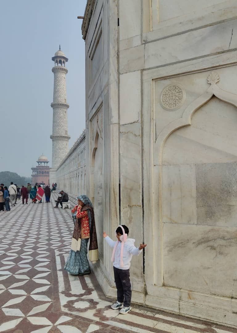 تنقلنا من محطة القطار بالعاصمة الهندية ديلهي، نحو مدينة "أغرا" على مسافة 230 كيلومترا، استغرقت قرابة الساعتين من الزمن. هناك في "أغرا"، استقللنا وسيلة نقل محلية، لنصل إلى ممر جميل مؤدٍ على مسافة تفوق الكيلومتر، قطعناها على متن مركبة من بين المركبات الحكومية المعدة خصيصا لنقل السياح الأجانب نحو المعلم الهندسي العالمي.