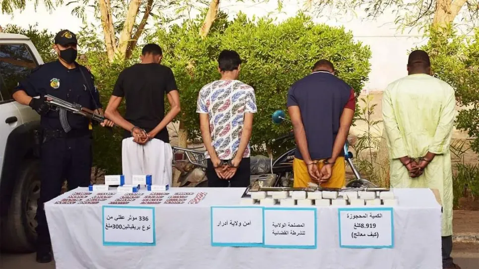 تمكنت قوات الشرطة القضائية لأمن ولاية أدرار من توقيف مجموعة إجرامية تتكون من أربعة أشخاص كما حجزت كمية معتبرة من المخدرات قاربت تعس كيلوغرامات من الكيف المعالج و336 قرص مهلوس بالإضافة إلى حجز دراجة نارية كانت تستعمل في عملية النقل والمتاجرة بالمخدرات. وقائع القضية تعود إلى ورود معلومات إلى قوات الشرطة مفادها وجود شخص يقوم بنقل المخدرات وسط مدينة أدرار واستغلالا لهذه المعلومات، تم توقيف المشتبه فيه، ليتم توقيفه رفقة شركائه مع إخضاعهم لعملية التلمس الجسدي أين عثر بحوزتهم على كمية من المخدرات تقدر بـ08.919كلغ من الكيف المعالج، واستغلالا للمعلومات المستقات من التحقيق تم مباش...