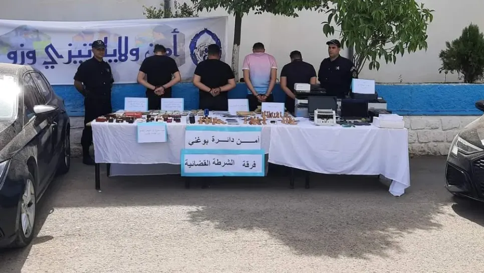 تمكنت مصالح أمن دائرة بوغني لأمن ولاية تيزي وزو من وضع حد لنشاط شبكة إجرامية منظمة تتكون من أربعة أفراد تتراوح أعمارهم بين (28 و45 سنة) يقوم عناصرها بصناعة وتقليد أختام لمختلف الهيئات والمؤسسات الرسمية للدولة واستعمالها في تزوير الملفات الإدارية والمحررات الرسمية مقابل مبالغ مالية. العملية مكنت من ضبط 267 ختم مقلد و495 مليون سنتيم، و29965 أورو من عائدات العمل الإجرامي، إضافة إلى وثائق ومحررات إدارية مزورة وثلاث مركبات سياحية وكمية من المعدن الأصفر.
