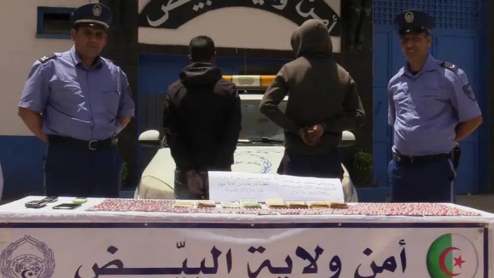 تمكنت مصالح الأمن الحضري الأول بأمن ولاية البيض، من حجز 1015 كبسولة من المؤثرات العقلية، مع توقيف شخصين مشتبه فيهما، يبلغان من العمر27 و 30 سنة . تعود حيثيات القضية، إثـــر تحصل عناصر الأمن الحضري الأول على معلومات مؤكـدة مفـادهـا وجود شخصين يقومان بترويج المؤثرات العقلية و المخدرات الصلبة في الوسط الشباني، عليه تـم تحديد هويتهما و الترصد لتحركاتهما ، أين تم إستصدار إذن بتفتيش مسكن المشتبه فيه الرئيسي صادر عن وكيل الجمهورية لدى محكمة البيض والذي كانت نتائجه إيجابية مكنت من حجز 1015 كبسولة من المؤثرات العقلية و مبلغ مالي من عائدات الترويج قدره 25 مليون سنتيم و 500 دج ، وعليه تـم تحويل ال...