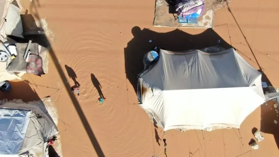 دفعت الأمطار الغزيرة وتساقط الجليد وهبوب رياح شديدة أكثر من 20 ألف لاجيء سوري إلى النزوح عن مخيماتهم شمال غربي البلاد.وقالت منظمات إغاثية إن المخيمات تحولت إلى "بحيرات" في أكثر من 87 موقعا شمال إدلب وغربي محافظة حلب وهي المناطق التي تسيطر عليها قوات المعارضة.واضطر بعض النازحين إلى التحول للإقامة في المباني العامة والبعض الآخر يعيش في العراء بينما انخفضت درجات الحرارة إلى ما دون الصفر.ونقلت تقارير صحفية أن أحد الأطفال توفي نتيجة ظروف الطقس القاسية.ويعيش في هذه المنطقة نحو 1.5 مليون شخص، قرابة 80 في المائة منهم من النساء والأطفال.وهجر أكثر من 12 مليون سوري منازلهم بسبب الحرب التي تشهده...