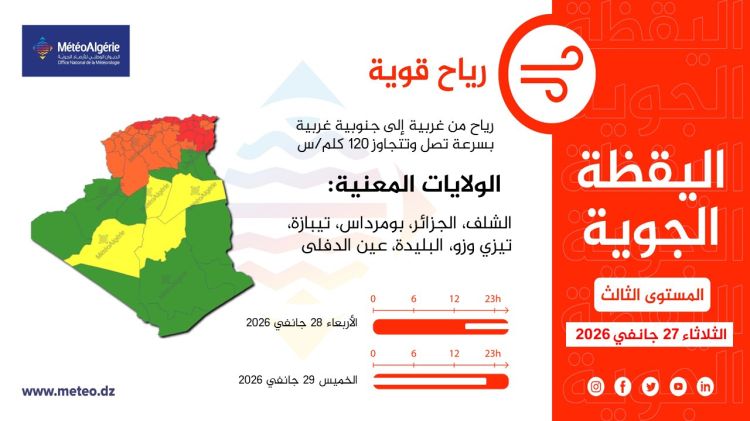 وأوضح نفس المصدر أنه "تبعا للنشرة الجوية الصادرة من الديوان الوطني للأرصاد الجوية عن هبوب رياح قوية على المناطق الساحلية وكذا المناطق الداخلية للوطن خلال الساعات القادمة تتراوح سرعتها ما بين 60 الى 80 كلم/سا وتصل ذروتها في بعض المناطق إلى 120 كلم في الساعة، دعت المديرية العامة للحماية المدنية باتباع التدابير والإجراءات الوقائية لتجنب الحوادث المنزلية وحوادث المرور المرتبطة بالتقلبات الجوية الناجمة عن الرياح".