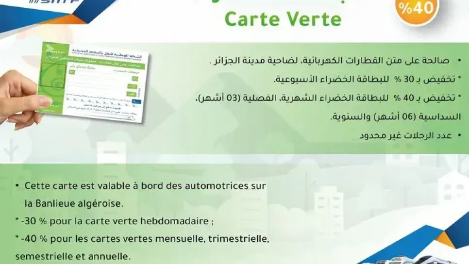 كشفت الشركة الوطنية للنقل بالسكك الحديدية، اليوم الثلاثاء، عن تخفيضات هامة توفرها البطاقة الخضراء للزبائن. وأوضح بيان الشركة عبر صفحتها الرسمية على "الفايسبوك"، أن هذه البطاقة الخضراء التي تمنح على مستوى المحطة، تسمح لصاحبها الاستفادة من تخفيضات تتمثل في: 30 بالمائة للبطاقة الخضراء الأسبوعية، و40 بالمائة للبطاقة الخضراء الشهرية، الفصلية (03 أشهر)، السداسية (06 أشهر) والسنوية. وأضاف البيان، أن البطاقات الخضراء صالحة على متن القطارات المكهربة، عبر شبكة ضواحي مدينة الجزائر العاصمة. وتعطي الحق في حرية التنقل عبر المسارات المشار إليها، ويمكن دفع مستحقات البطاقات الخضراء السنوية عبر 3 أقساط متتالي...