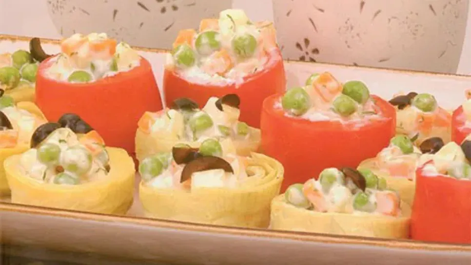 المقادير 6 حبات طماطم، 6 حبات قرنون منظف ومغلي، زيت زيتون، 1 ملعقة كبيرة عصير ليمون،  1 ملعقة كبيرة خل أبيض، ملح، فلفل أبيض، 3 ملاعق كبيرة بطاطا مغلية ومقطعة مكعبات صغيرة، 3 ملاعق  كبيرة جزر مغلية ومقطعة قطع صغيرة، ملعقة كبيرة جلبانة مغلية، ملعقة كبيرة معدنوس مقطع رقيق،  4 ملاعق كبيرة مايونيز، زيتون أسود للتزيين.التحضير نحضر كل المقادير اللازمة.نقطع الجهة العلوية للطماطم ونحفر حفرة داخلها ثم نفرغها.ننظف القرنون ونقشره ونحفر داخله.في وعاء نضع زيت زيتون مع عصير الليمون، الخل،الملح، الفلفل الأبيض، ثم نخلط جيدا.نضيف البطاطا، الجزر، المعدنوس مع الخلط جيدا وفي الأخير نضيف ال...