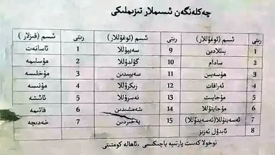 حظرت السلطات الصينية 22 اسماً على مسلمي الصين في مقاطعة هوتن بأقليم شينجيانغ إذ علقت الشرطة منشوراً بقائمة تضم 22 اسماً يستخدمه المسلمون وطلبت منهم تغيير أسماء أبنائهم وإلا سيتم منعهم من دخول المدارس.وحسب موقع الرياض السعودي تتضمن قائمة الأسماء التي حظرت السلطات الصينية على المسلمين استخدامها 15 اسماً للذكور وسبعة للإناث، منها أسماء مثل: بن لادن، صدام، حسين، عرفات، مجاهد، عبد العزيز، سيف الله، أسد الله، سيف الدين، شمس الدين، ذكر الله، نصر الله، آمنة، خديجة، فاطمة، عائشة، مسلمة، مؤنسة، مخلصة بحسب تقرير لراديو آسيا. ونقل التقرير عن مسلمين في الإقليم قولهم إن السلطات في شمال غرب الصين أبلغتهم أن...