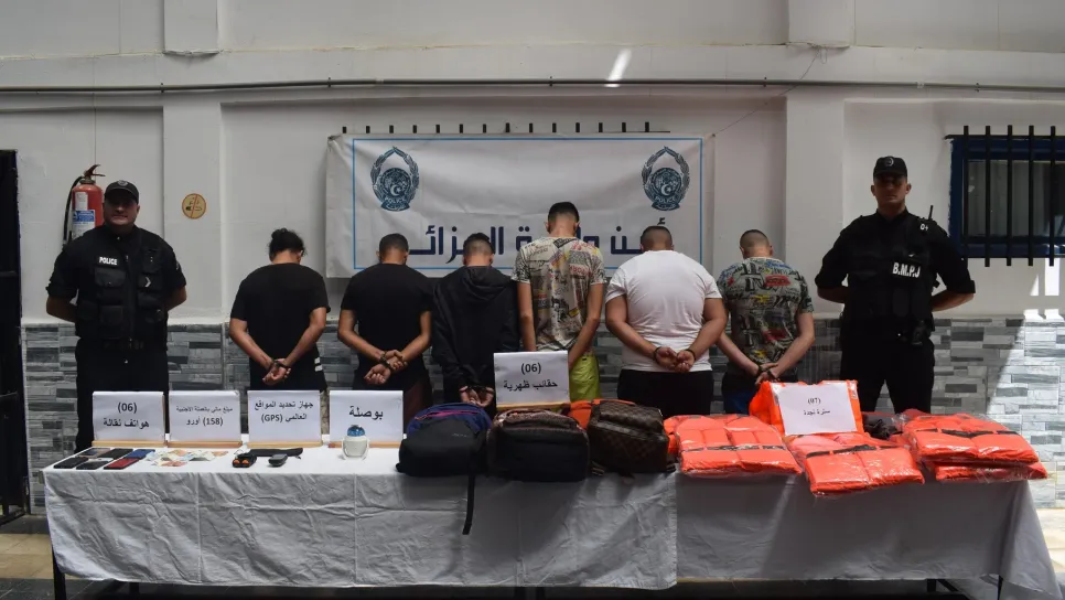 أوقفت مصالح أمن ولاية الجزائر 6 أشخاص مشتبه فيهم كانوا بصدد تهريب أشخاص بطريقة غير شرعية . وأوضح بيان لذات المصالح ، أن الفرقة القضائية الحمامات أوقفت 6أشخاص كانوا بصدد تهريب أشخاص مهاجرين ، من بينهم المدبرين الرئيسيين . وأضاف البيان ، أنه تم حجز قارب نُزهة بمحرِّك بقوّة 40 حصانا، 12دلو بنزين، 7 سترات نجدة. جهاز تحديد المواقع (GPS)، بوصلة، مِنظار ليلي، ومبلغ مالي قدره 158 أورو ومركبة