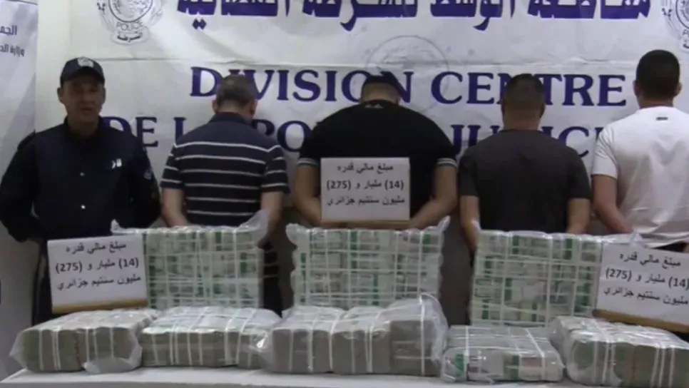 وتابع البيان: "إن التحريات التي قامت بها المصلحة المعنية مكنت من تحديد هوية أفراد الشبكة وتوقيفهم تباعا، مع ضبط 14 مليارا و275 مليون سنتيم جزائري، بالإضافة كذلك إلى مركبتين كانتا تستعملان في نقل هذه الأموال".