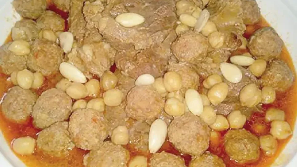 المقاديرلحم غنم، 500غ لحم مفروم، 1 كوب حمص منقوع، 02 حبات بصل متوسط الحجم، ثوم، 1 ملعقة كبيرة زيت أو سمن، 1 ملعقة صغيرة صلصة طماطم، 1/2 ملعقة صغيرة فلفل أسود، 1/2 ملعقة صغيره قرفة، ملعقة كبيرة كمون، 1 ملعقة صغيرة فلفل أحمر.التحضير يقطع اللحم إلى قطع متوسطة الحجم، نضعها في قدر ونضع معها حبة بصل مقطعة قطعا صغيرة، ملح، فلفل أسود، قرفة وزيت وسمن ونتركها تتقلى على نار هادئة. يهرس الثوم مع الكمون ونضع نصف الكمية في القدر. نجهز اللحم المفروم، نضع فيه حبة بصل، فلفل أسود، قرفة، ملعقة صغيرة فلفل أحمر ونصف كمية خليط الثوم، نخلطهم جيداً ونشكّلهم كريات متوسطة الحجم. عندما يتقلى اللحم جيدا، نضع نصف لت...
