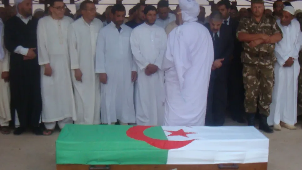 في موكب جنائزي مهيب وبعيون دامعة وقلوب حزينة ودع سكان مدينة المشرية عشية أمس شهيد الواجب الوطني النقيب في القوات الخاصة لعموري محمد الذي كان ضحية كمين إرهابي جبان ضواحي منطقة المدية عقب انفجار لغم أودى بحياته وهو في عز شبابه تاركا وراءه الطفلة جنان في ربيعها الثاني وزوجة أرملة حامل وأما مريضة لم تتحمل وقع الصدمة وكيف لا وهو صغير العائلة وابنها المدلل. وقد وري الشهيد الثرى بمقبرة سيدي المربوح بمدينة المشرية في أجواء حزينة وتنظيم رسمي وودعته جموع غفيرة من المواطنين في حضور السلطات الولائية والأمنية وكبار المسؤولين في الجيش، وقرأت على روحه فاتحة الكتاب تحت الأضواء الكاشفة لمصالح الحماية المدني...