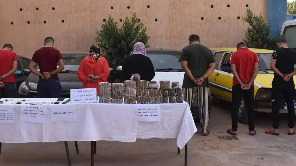 تمكن اليوم عناصر الشرطة القضائية بأمن دائرة العين الصفراء جنوبي النعامة من تفكيك شبكة إجرامية منظمة تقوم بنقل وترويج المخدرات. العملية مكنت من توقيف ثمانية أشخاص من بينهم امرآتان وحجز 12 كيلوغراما و300 غرام من الكيف المعالج على شكل صفائح كانت مخبأة في حقيبة ، كما تم حجز ثمانية هواتف نقالة ومبلغ مالي معتبر من عائدات بيع هذه السموم وأربع مركبات سياحية كان يستعملها أفراد الشبكة في نقل وترويج البضاعة المحجوزة. وبعد استكمال كافة الإجراءات القانونية، تم تقديم المتورطين أمام الجهة القضائية المختصة إقليميا.