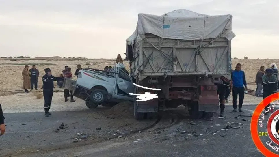 توفي شخص في اصطدام بين سيارة نفعية وشاحنة وقع مساء أمس الخميس على الطريق الرابط بين طريفاوي وحاسي خليفة بولاية الودي. وأفادت خلية الإعلام والاتصال للحماية المدنية لذات الولاية عبر صفحتها على الفايسبوك، أن الوحدة الثانوية بالدبيلة بدعم من وحدة حاسي خليفة، تدخلت مساء الخميس، إثر حادث مرور مميت وفع على مستوى الطريق الرابط بين بلدية طريفاوي وقرية الصحين تمثل في اصطدام عنيف بين شاحنة وسيارة نفعية ذات قمرتين من نوع "سوكون". وأضاف نفس المصدر أن الحادث خلف حالة وفاة في عين المكان وهو شاب يبلغ من العمر 37 سنة تم نقله جثته إلى مصلحة حفظ الجثث للمؤسسة الصحية بالدبيلة.