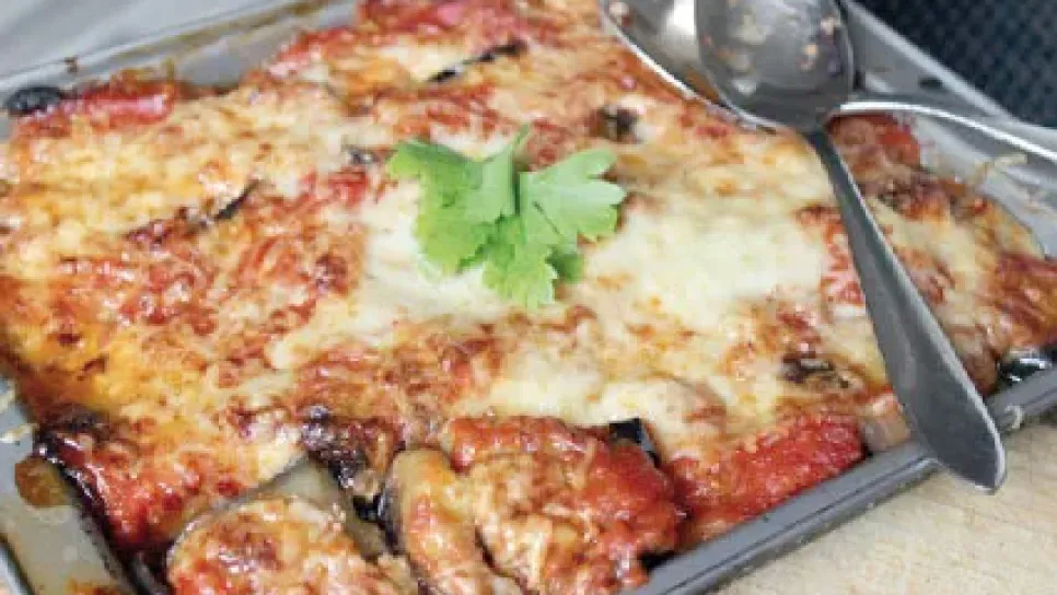 المقادير: حبة باذنجان مقلية، 4 حبات بطاطا مقلية، 300 غ لحم مفروم، بقدونس، ملعقة صغيرة ملح، ملعقة صغيرة فلفل أسود، ملعقة صغيرة بهار مشكل، 4 حبات طماطم مفرومة وملعقتا معجون طماطم، حبة بصل مفرومة، كأس كريمة الطبخ، جبن مبشور، ملعقتا زيت.طريقة التحضير: في الطنجرة ضعي اللحم المفروم، أضيفي البصل والملح والبهارات. عند استواء اللحم والبصل أضيفي الطماطم. دعيها تغلي قليلا ثم ضعي البقدونس المفروم.في صينية الفرن صفي حبات البطاطا المقلية، ثم قومي بوضع طبقة من خليط اللحم، وزعي الخليط جيداً فوق حبات البطاطا. ضعي طبقة من الباذنجان، كرري وضع طبقة أخرى من خليط اللحم المفروم فوق طبقة الباذنجان المقلي. صبي الكريمة...