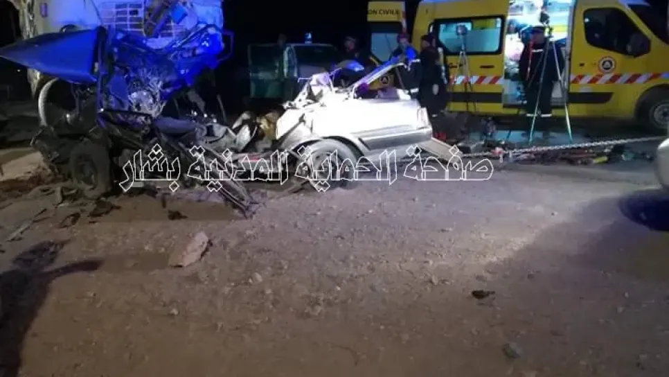 خلف، فجر يوم الأحد ، حادث مرور وفاة أربعة أشخاص بولاية بشار . وأفاد بيان لعناصر الحماية المدنية ،أن فرق الإنقاذ والإسعاف التابعة للحماية المدنية لولاية بشار ، تدخلت فجر اليوم الأحد على الساعة الثانية صباحا وثلاثة وأربعون دقيقة ، لأجل حادث مرور وقع في الطريق الوطني رقم 06RN بالمخرج الجنوبي لمدينة بشار. وحسب ذات البيان ، الحادث خلف وفاة أربعة أشخاص في عين المكان من جنس ذكر تبلغ أعمار إثنين منهم مابين 30 و 45 سنة والبقية مجهولو الهوية، كانوا على متن السيارة بيجو 505، وقد تم نقلهم من طرف مصالح الحماية المدنية الى مصلحة حفظ الجثث بالمستشفى.