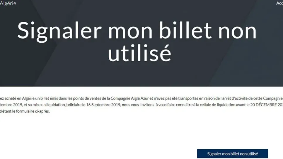 ينهى إلى علم الأشخاص الذين سبق لهم أن اشتروا تذكرة في الجزائر صادرة عن المحلات التجاريةAigle Azurولم يتم نقلهم بسبب توقف نشاط هذه الشركة في 6 سبتمبر 2019 وتصفيتها الإجبارية في 16 سبتمبر 2019 ،أنهم مدعوونللإعلان عن أنفسهم لوحدة التصفية قبل تاريخ 24 ديسمبر 2020 ،ويتم ذلك إما على بوابة الويب:https://sites.google.com/aigle-azur.dz/declarer-mon-billet-non-utilisأو بالبريد على العنوان التالي: وحدة تصفية إيجل أزور، مبنى موريتانيا 01 ، ساحة بيرو، الجزائر العاصمة 16000. يتعين على المعنيين بالأمر (حاملي التذاكر المدفوعة وغير المستخدمة) تحديد رقم التذكرة وبيان الهوية البنكي الخاص بهم نص البيان pdf